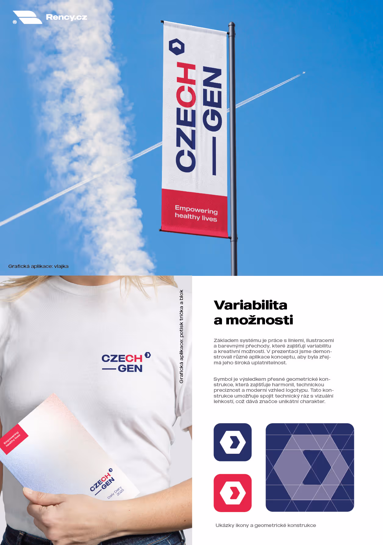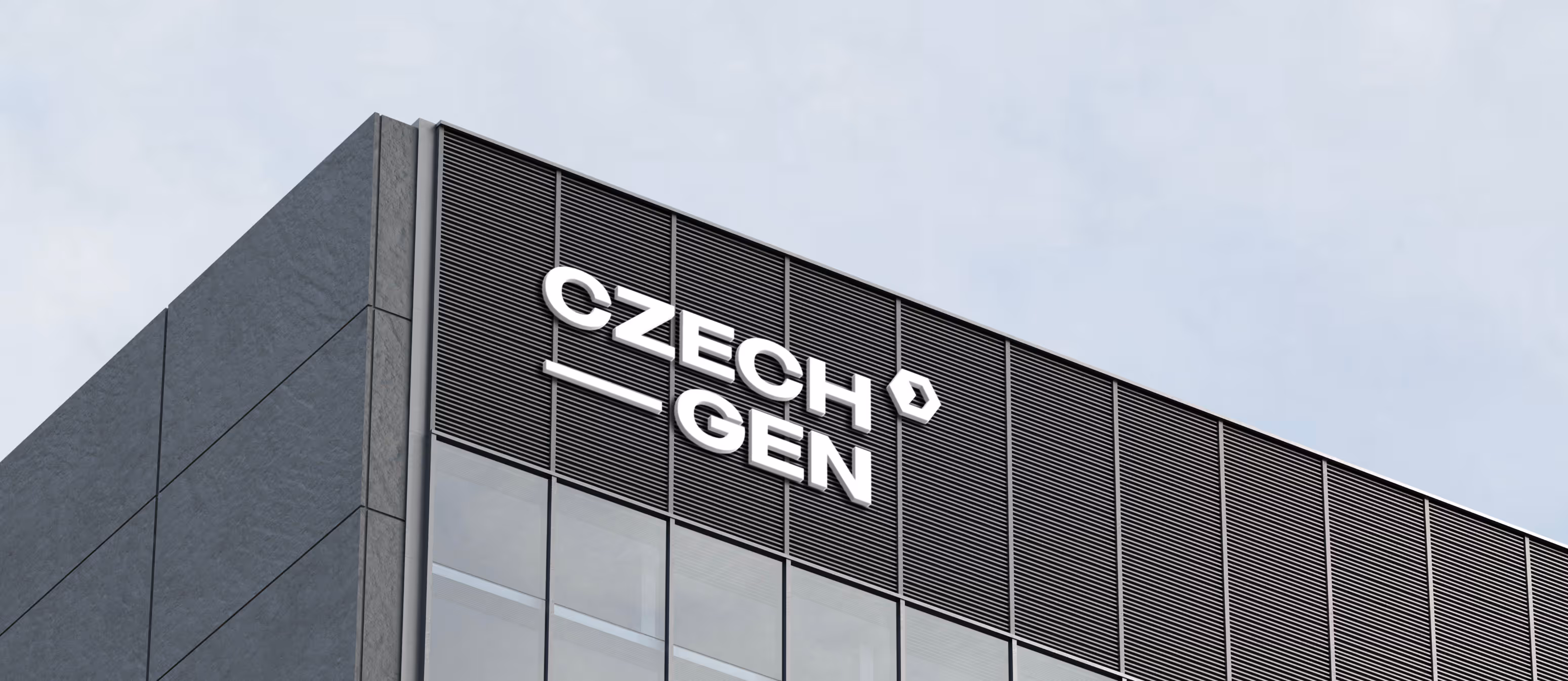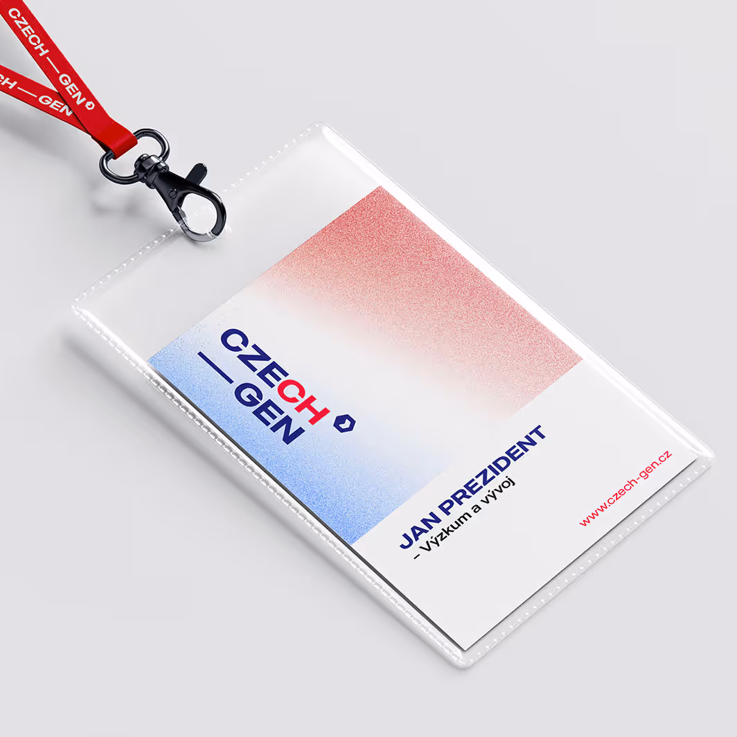 Jako základ vizuální identity jsme zvolili motiv přechodu se zrnem, který propojuje barvy české trikolóry a stylizované molekulární struktury odkazující na chemické a materiálové zaměření skupiny Czech Gen. Tento prvek symbolizuje propojení národní identity s vědeckou přesností a inovací. Plynulý přechod barev vyjadřuje kontinuitu, energii a soulad mezi jednotlivými oblastmi působení skupiny.